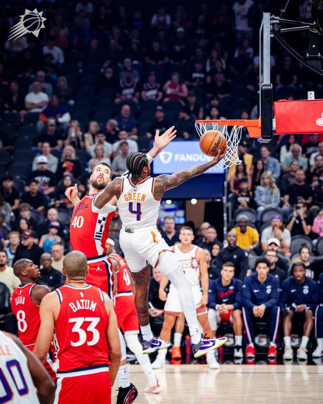 格林太阳首秀就命中了6记三分,刷新了队史纪录。此前纪录是阿里扎、以赛亚-托马斯和蒂姆-托马斯的5记。格林在进攻端的暴走,分担了布克的得分压力。格林的首秀,堪称完美。