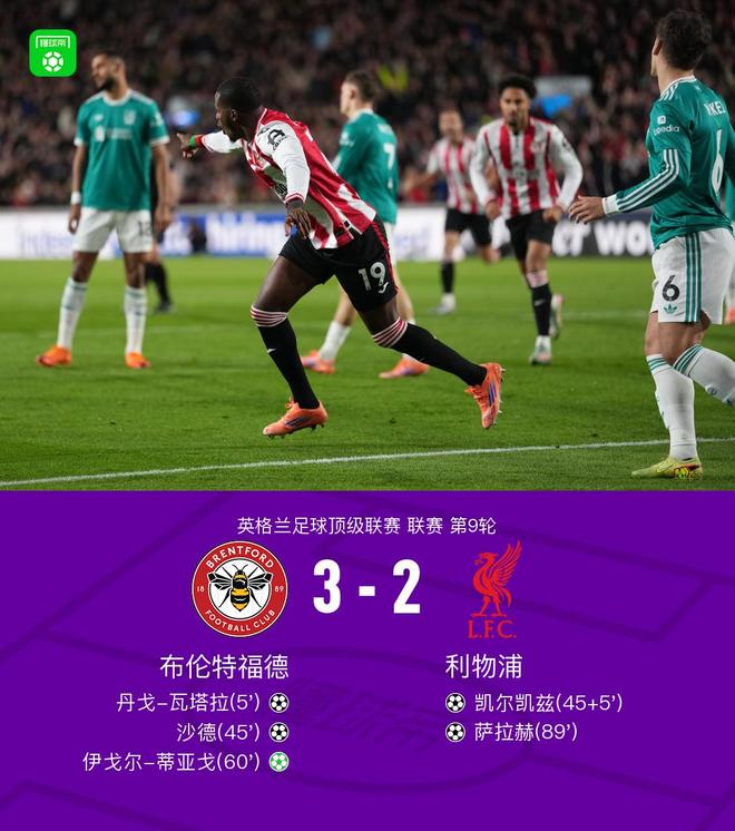 北京时间10月26日,英格兰足球超级联赛第9轮展开较量,布伦特福德坐镇主场迎战利物浦。上半场瓦塔拉倒钩破门,维尔茨中路爆射滑门而出,沙德单刀扩大比分,凯尔凯兹中路打门扳回一球,下半场蒂亚戈点射破门,瓦塔拉屡造险,萨拉赫爆射扳回一球。最终,全场比赛结束,布伦特福德以3-2战胜利物浦。