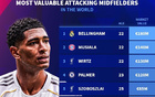 德转列进攻型中场身价榜:贝林1.8亿欧居首,穆西亚拉第二 -